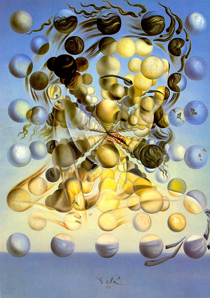 En pleno Renacimiento europeo, en el primer tercio del siglo XVI, los anamorfismos se habían generalizado. Uno de los más celebrados es de Hans Holbein el Joven en el cuadro titulado Los embajadores. En él se insiste en la temática de moda referida a la brevedad de la vida y del acecho de la muerte. Una irreconocible calavera nos observa en la base del cuadro más allá de la pose mundana de los embajadores. Solo podemos apreciar que la muerte está presente en la escena si observamos el cuadro desde una determinada y precisa posición. Igual que en la vida misma.Pero ¿qué es un anamorfismo? Me he tomado la libertad de realizar uno tomando como referencia una imagen terrible que circula por internet. Un anamorfismo es la desintegración de una imagen para que pueda tener sentido cuando se la observa desde una determinada posición. Es la constatación de que nuestros sentidos nos engañan y que solo debemos confiar en el intelecto. En la imagen, estirada con un programa de construcción 3D (Rhinoceros) y colocada sobre una de las caras de una cuña, nos ofrece una imagen terrible, pero familiar, cuando la observamos desde una determinada posición. En el momento en que variamos nuestro punto de mira la imagen sufre deformaciones incompatibles con la realidad. Eso es todo, y en resumen: un anamorfismo es una pura cuestión de perspectiva. Una imagen cualquiera está compuesta por un conjunto de fotones con diferente longitud de onda que, viajan a la velocidad de la luz e inciden en nuestra retina. En la Gala placidia/ Galatea de las esferas de Salvador Dalí, el pintor nos ofrece una sugestiva imagen de su pareja y musa ( Elena Ivánovna Diákonova) que, en realidad, proviene de una descomposición de la misma que él reordena con su pincel y reconstruye en un retrato reconocible para el ojo del espectador. Dalí nos está diciendo que todo (por supuesto, también el arte) es una combinación de naturaleza y subjetividad, de química, física e intencionalidad. En realidad nos está proporcionando un punto de vista privilegiado desde donde observar su ser más preciado: un anamorfismo, en definitiva.Me he permitido hacer de Dalí, pero, en este caso con una imagen de mi nieta Gala. La he sometido a una desintegración y he variado el punto de observación hasta construir una imagen realista de ella.Un ejemplo de desintegración a lo Dalí en este caso sobre una imagen de la Wikimedia. Podríamos decir que se acerca más a la idea daliniana y, todavía sería más certera, si sustituyéramos los círculos por esferas.